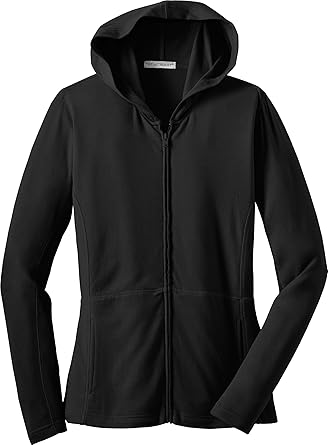 Port Authority Women's Modern Stretch Cotton Full-Zip Jacket. L519, Women of all shapes will appreciate our Modern Stretch Cotton Collection. With an updated fit and figure-flattering details, the extra soft cotton is combined with a dash of spandex to retain shape???and make the most of yours. Weve added extra length throughout the body for styles that move with you for exceptional comfort all day long. 6.5-ounce, 96/4 cotton/spandex stretch fabric. 1x1 rib knit construction. Gently contoured silhouette. Self-fabric hood. Dyed-to-match zipper. Front slash pockets. Open cuffs and hem.